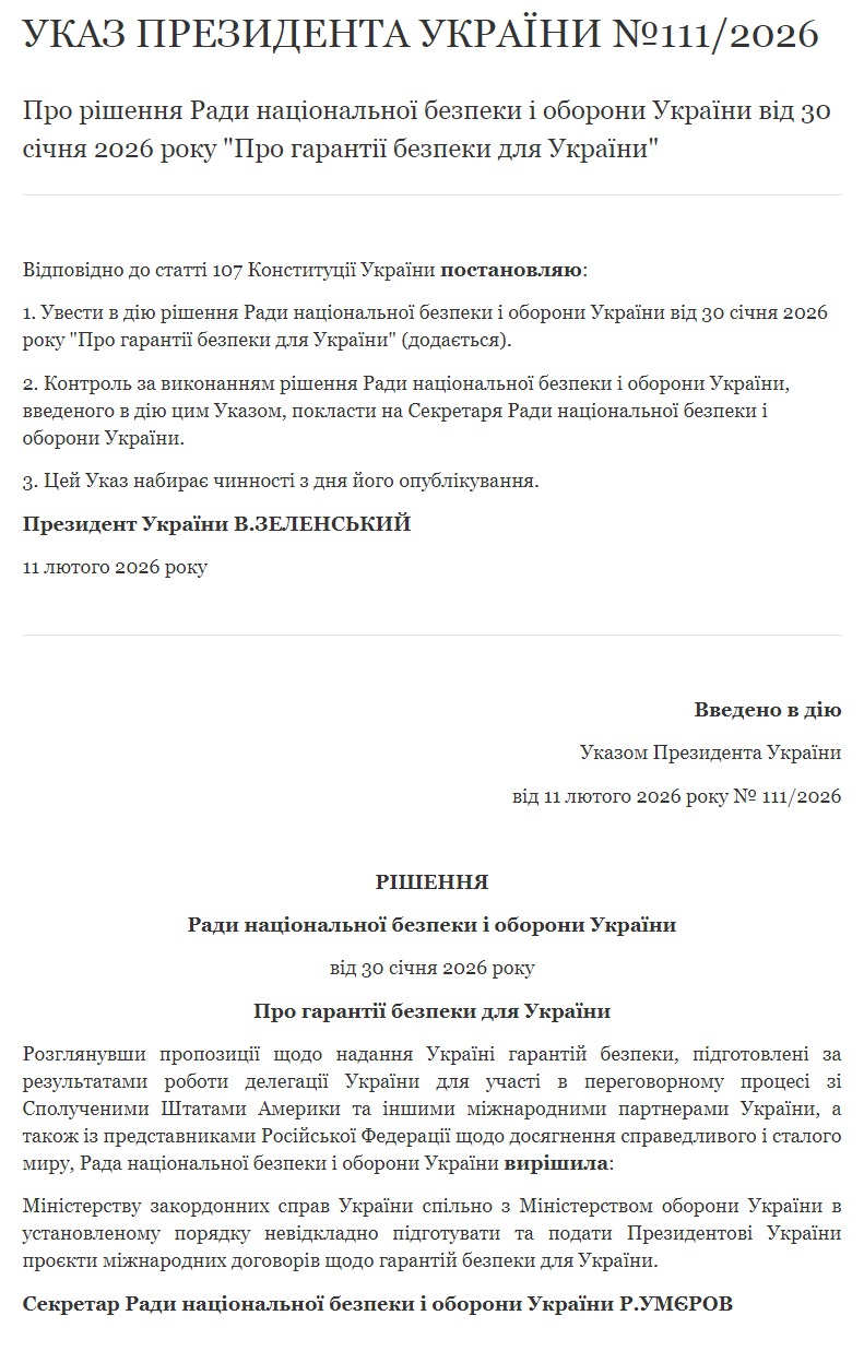 "Рассмотрев предложения о предоставлении Украине гарантий безопасности, подготовленные по результатам работы делегации Украины для участия в переговорном процессе с США и другими международными партнерами Украины, а также с представителями Российской Федерации о достижении справедливого и устойчивого мира, Совет национальной безопасности и обороны Украины решил Министерству иностранных дел Украины совместно с Министерством обороны Украины в установленном порядке безотлагательно подготовить и подать президенту Украины проекты международных договоров по гарантиям безопасности для Украины", - сказано в решении СНБО.