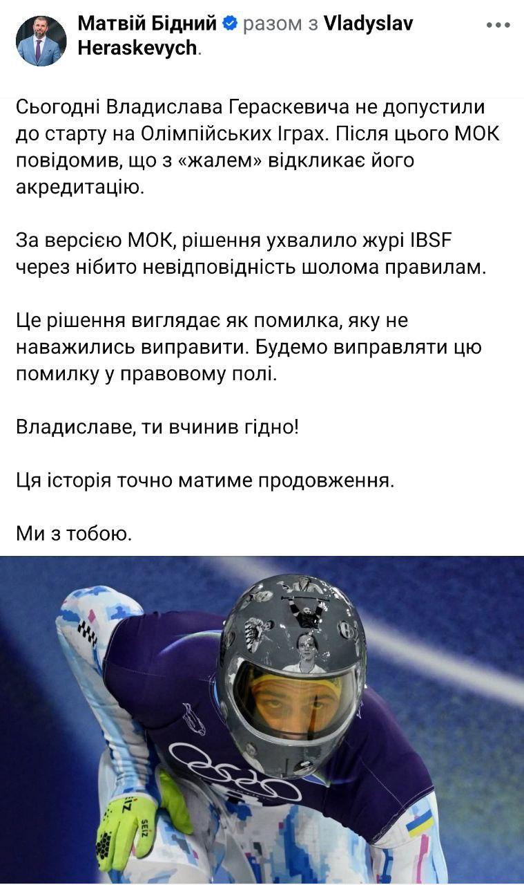 "Сегодня Владислава Гераскевича не допустили к старту на Олимпийских играх. После этого МОК сообщил, что с "сожалением" отзывает его аккредитацию. По версии МОК, решение приняло жюри IBSF из-за якобы несоответствия шлема правилам. Это решение выглядит как ошибка, которую не решились исправить. Будем исправлять эту ошибку в правовом поле. Владислав, ты поступил достойно! Эта история точно будет иметь продолжение. Мы с тобой", - написал в своем Facebook министр.