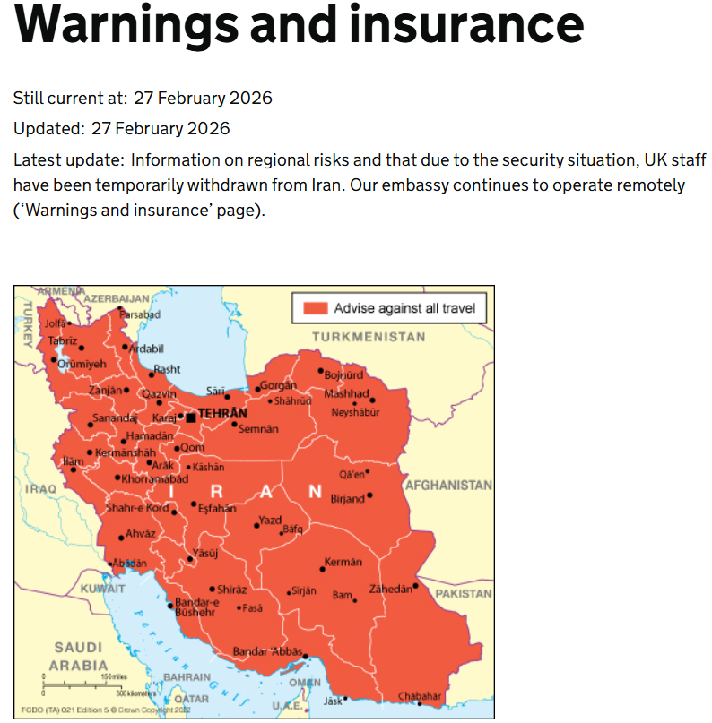 "Поддержка со стороны правительства Великобритании в Иране крайне ограничена. В чрезвычайных ситуациях личная консульская помощь будет невозможна", - говорится в пресс-релизе.