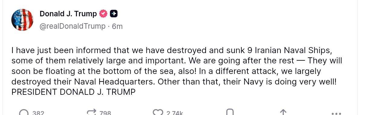 "Меня только что проинформировали, что мы уничтожили и потопили 9 иранских военно-морских кораблей, некоторые из них были относительно крупными и важными", - написал он в своей соцсети.
