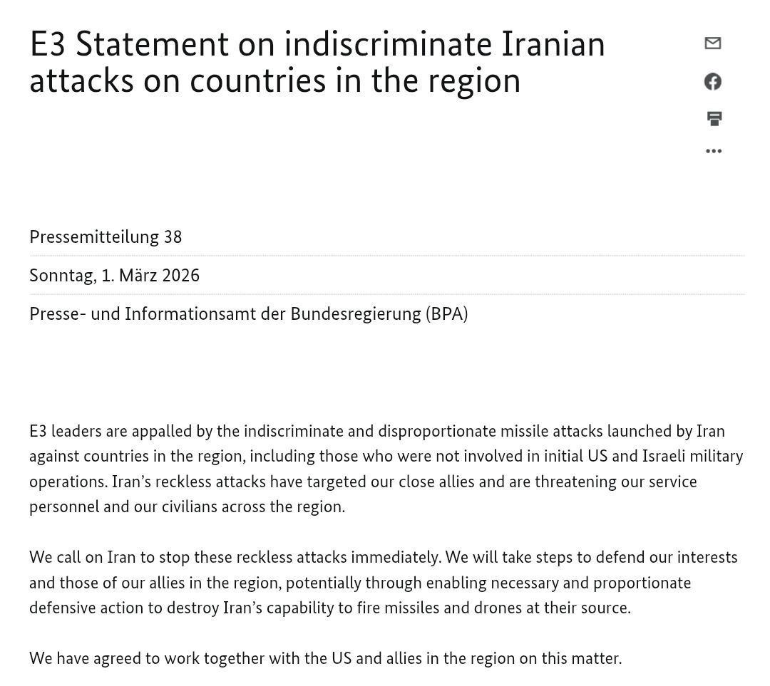 "Мы призываем Иран немедленно прекратить эти безрассудные атаки. Мы предпримем шаги для защиты наших интересов и интересов наших союзников в регионе, потенциально включая обеспечение необходимых и соразмерных оборонительных действий с целью уничтожения возможностей Ирана запускать ракеты и дроны", - говорится в совместном заявлении, опубликованном на сайте немецкого правительства.