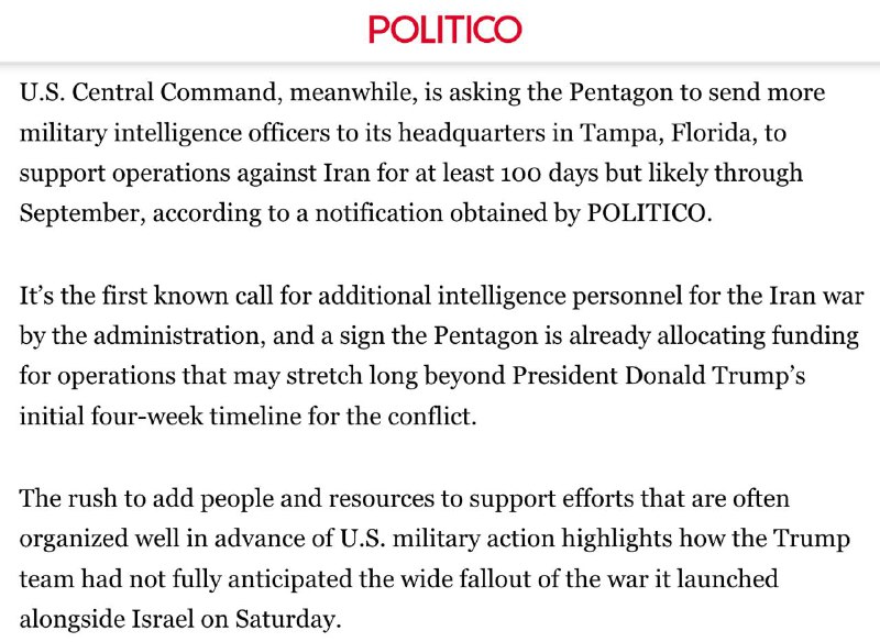 По данным газеты, Центральное командование США запросило у Пентагона дополнительный персонал военной разведки для поддержки операций против Ирана как минимум на 100 дней, а вероятно, до сентября. Речь идет о направлении дополнительных офицеров разведки в штаб командования в Тампе (штат Флорида), который координирует операции США на Ближнем Востоке.
