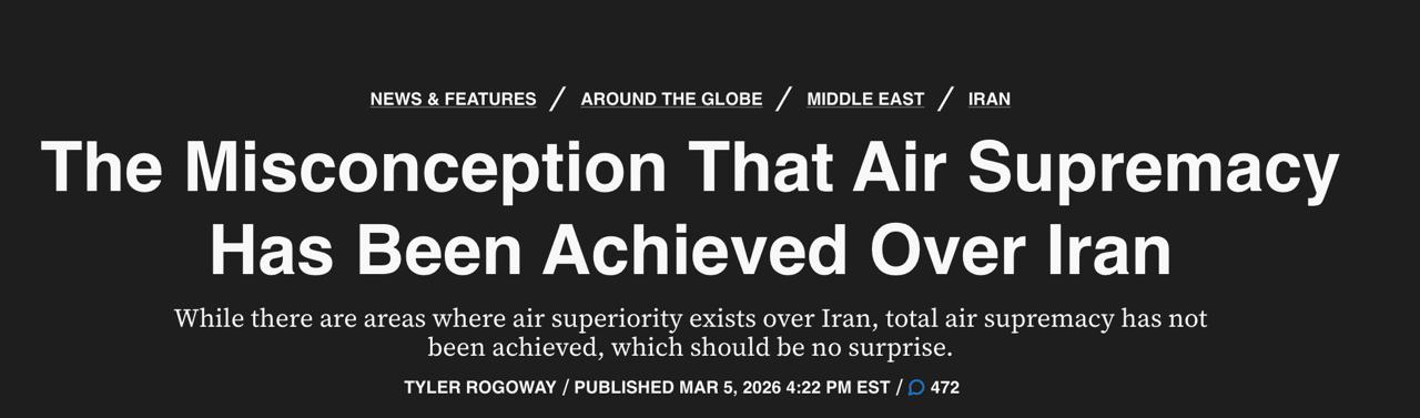 10:13 Журнал The War Zone отрицает распространенное мнение, по которому США и Израилю удалось добиться полного превосходства в воздухе над Ираном. По его оценке, превосходство было достигнуто только в отдельных районах, но полной свободы действий у авиации США и Израиля нет.
