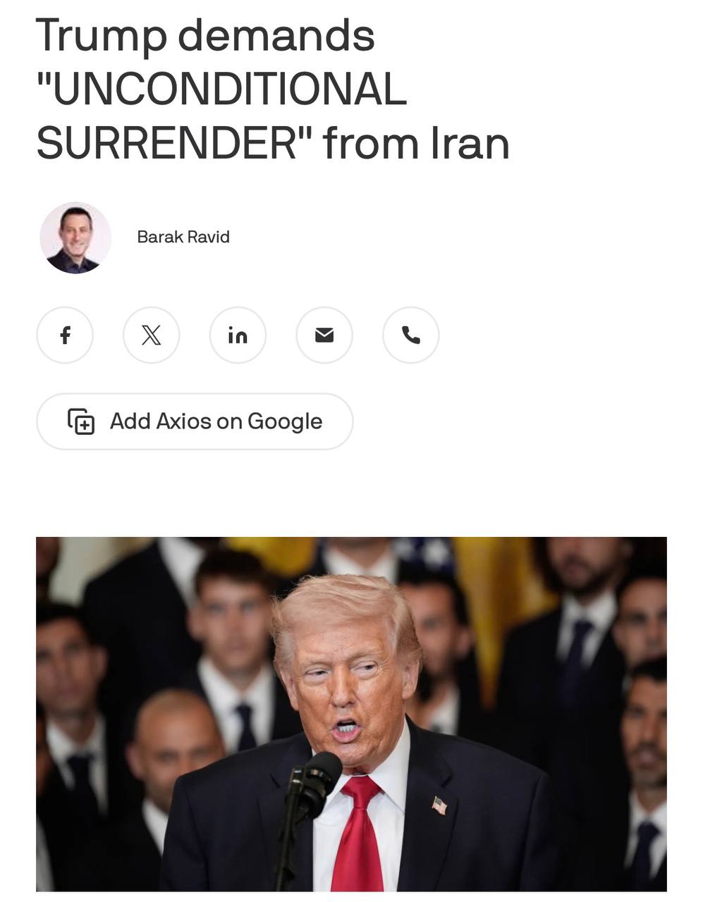 22:26 Трамп скорректировал свое заявление о "безоговорочной капитуляции" Ирана - "она может быть неофициальной", сообщает Аxios.
