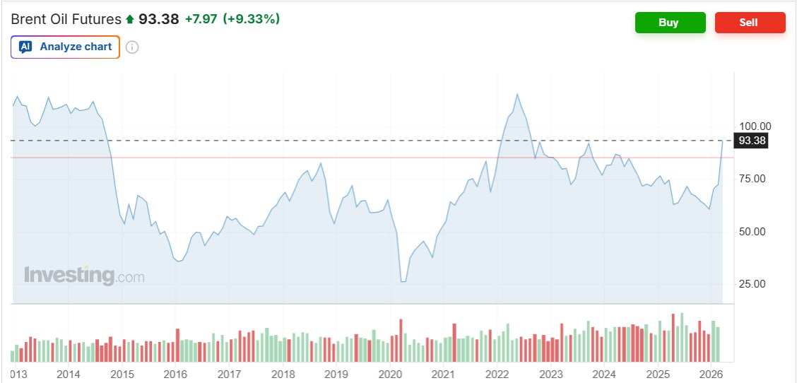 Стоимость майских фьючерсов на сорт Brent на лондонской бирже ICE Futures по данным выросла на 9,3%, до $93,38 за баррель.