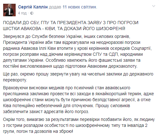 "Обратился в Службу безопасности Украины, другие силовые органы, к президенту Украины, чтобы там отреагировали на неоднократные угрозы советника Авакова Ильи Кивы утопить в крови руководителей ячеек Соцпартии, угрозы расправы над действующим руководством СПУ и СДП, народными депутатами Украины. Особенно волнуют его фашистские заявления и постоянные высказывания по подготовке Аваковым госпереворота. Еще раз, отдельно прошу обратить внимание на многочисленные призывы к государственному перевороту. Учитывая выводы медиков о психическом состоянии аваковского приспешника призываю провести все мероприятия в кратчайшие сроки, ведь шизофренические состояния могут быть причиной безосновательной агрессии, а следовательно, Кива потенциально опасен для окружающих. Прошу силовиков обеспечить защиту адресатов от его угроз. Кроме того, требую по результатам проверки лишить его, как человека с острым расстройством личности по шизофреническом типа и инвалида 2 группы, погон и разрешений на оружие", - написал нардеп.