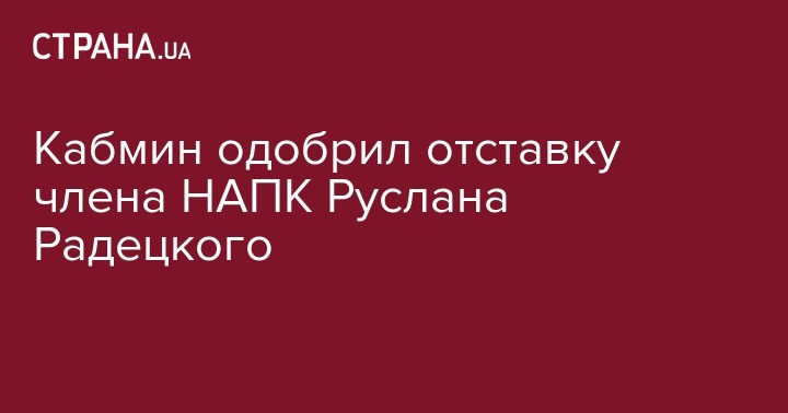 Кабинет Министров в четверг, 18 августа, одобрил отставку заместителя председателя Национального агентства по предотвращению коррупции (НАПК) Руслана Радецкого. Об этом говорится в распоряжении правительства №540 от 18 августа.