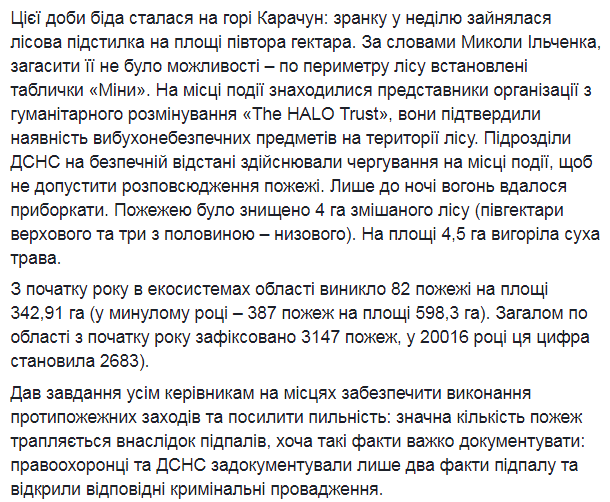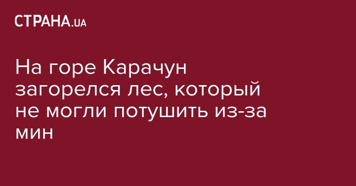 "В течение суток беда произошла на горе Карачун: утром в воскресенье загорелась лесная подстилка на площади полтора гектара. По словам Николая Ильченко (руководитель ГУ ГосЧС в Донецкой обл., - Прим. ред.), потушить его не было возможности – по периметру леса установлены таблички "Мины".