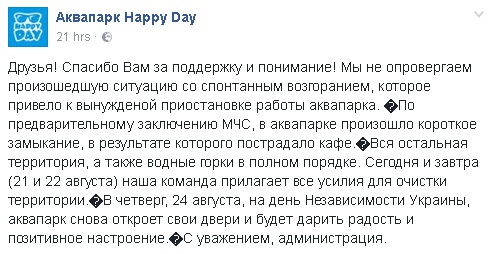 "По предварительному заключению ГосЧС, в аквапарке произошло короткое замыкание, в результате которого пострадало кафе. Вся остальная территория, а также водные горки в полном порядке. Сегодня и завтра (21 и 22 августа) наша команда прилагает все усилия для очистки территории", - отмечается на сайте.