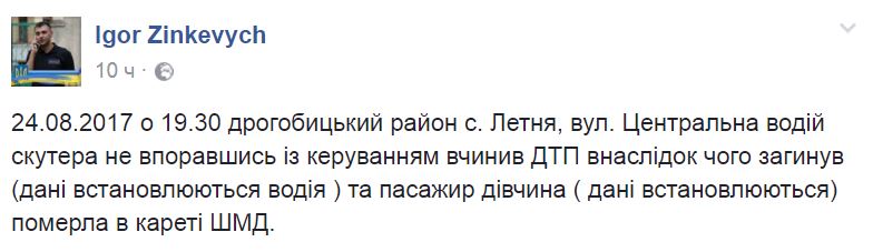 24 августа во Львовской области в селе Летня в ДТП погибли 18-летний водитель скутера и его 14-летняя пассажирка. Об этом сообщил депутат Львовского горсовета Игорь Зинкевич на своей странице в Facebook.