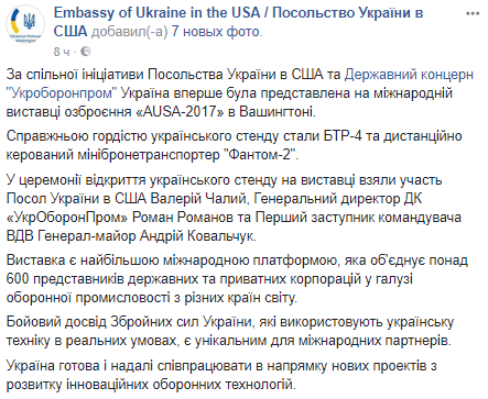 На международной выставке вооружения "AUSA-2017", которая проходит в США, впервые была представлена Украина. Об этом в Facebook сообщает посольство Украины в США.
