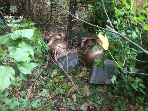 Утром 15 октября небезразличные львовяне сообщили правоохранителям, что стали свидетелями кражи фигур. Очевидцы предоставили описание воров и указали место, где те спрятали украденное - а именно в кустах на улице Оглоблина.