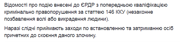 Данные об этом внесены в ЕРДР с предварительной квалификацией уголовного преступления по ст. 146 Уголовного кодекса Украины - "Незаконное лишение свободы или похищение человека".