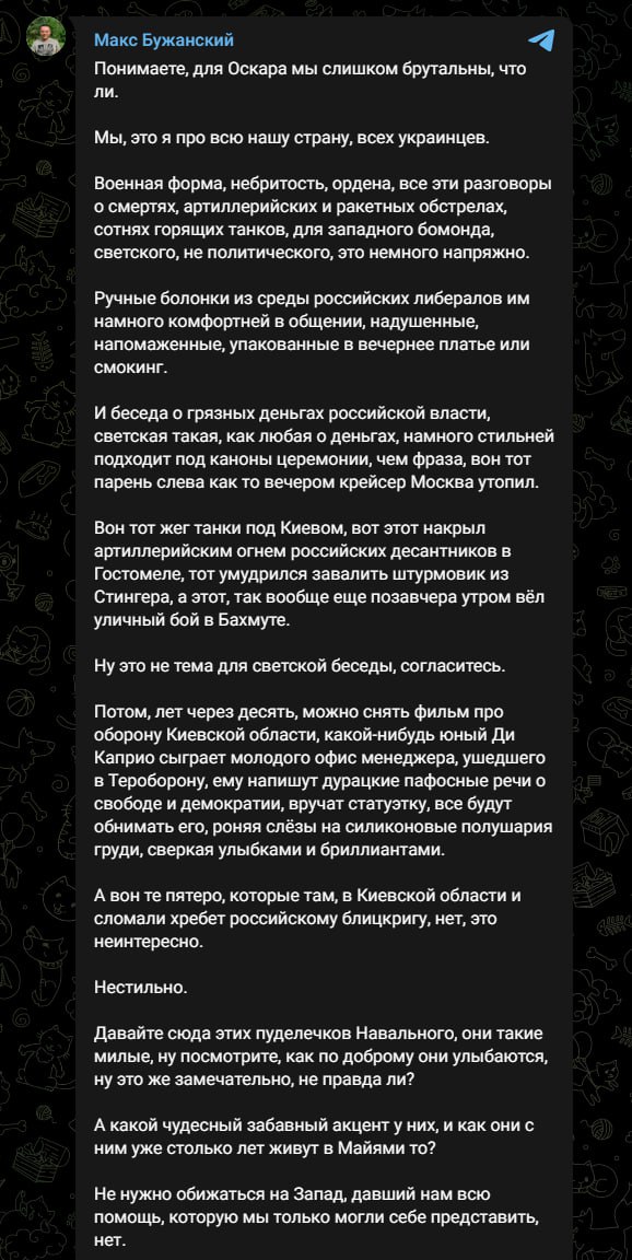 Нардеп Макс Бужанський припустив, що Україна для "Оскара" "занадто брутальна", а "ручні болонки з-поміж російських лібералів їм набагато комфортніші в спілкуванні".
