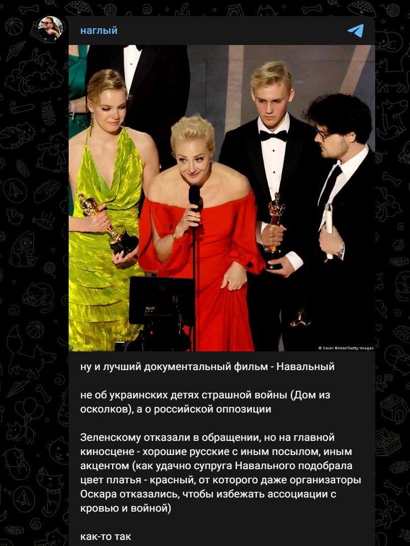 "Зеленському відмовили у зверненні, але на головній кіносцені - хороші росіяни з іншим посилом, іншим акцентом (як вдало дружина Навального підібрала колір сукні - червоний, від якого навіть організатори Оскара відмовилися, щоб уникнути асоціації з кров'ю та війною). Якось так ", - пише журналіст Макс Назаров.