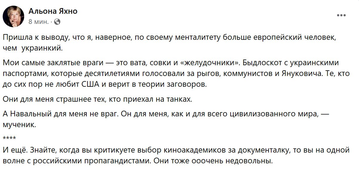 Але є й інші погляди. Блогер Олена Яхно заявила, що Навальний для неї "не ворог. Він для мене, як і для всього цивілізованого світу - мученик".