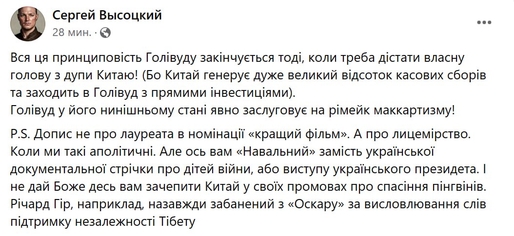 Екс-депутат Сергій Висоцький вважає, що "Голлівуд у його нинішньому стані явно заслуговує на рімейку маккартизму". Він розкритикував декларовану аполітичність кіноакадемії та назвав її "лицемірством": "Але ось вам "Навальний" замість української документальної стрічки про дітей війни або виступ українського президента".