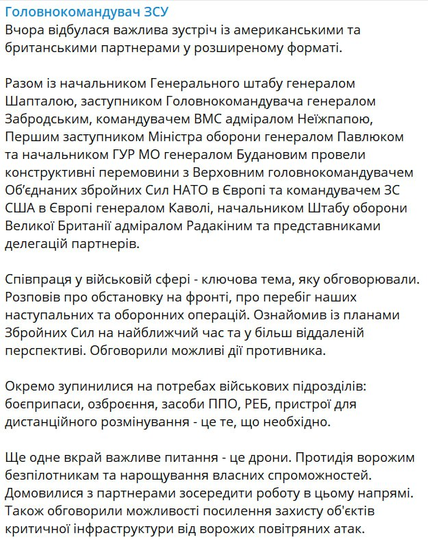 "Ще одне дуже важливе питання – це дрони. Протидія ворожим безпілотникам та нарощування власних можливостей. Домовилися з партнерами зосередити роботу у цьому напрямі", – сказав Залужний.
