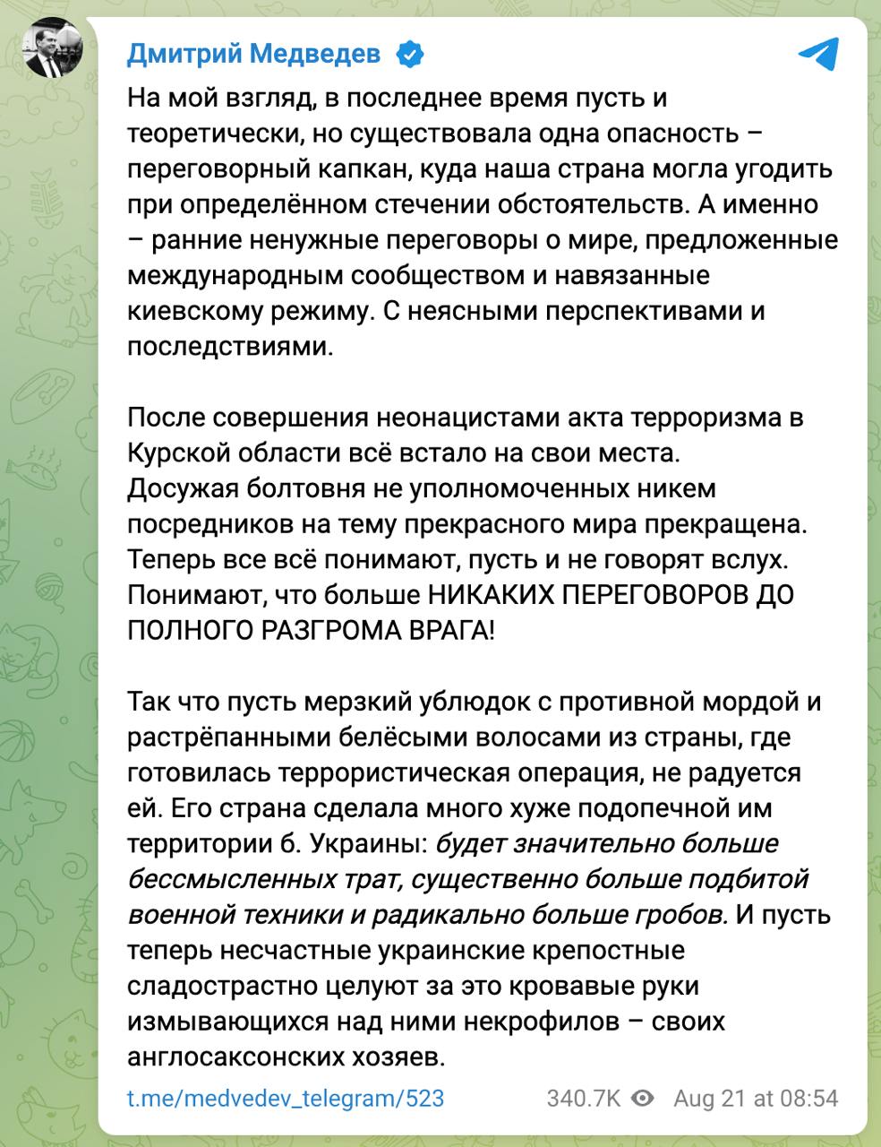 "Останнім часом нехай і теоретично, але існувала одна небезпека - переговорний капкан, куди наша країна могла потрапити при певному збігу обставин. А саме - ранні непотрібні переговори про мир, запропоновані міжнародною спільнотою і нав'язані київській владі. здійснення акту тероризму в Курській області все стало на свої місця", - заявив Медведєв.
