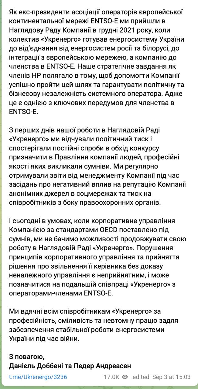 Вони повідомляють, що Кудрицького звільнили після його звіту щодо захисту енергооб'єктів від обстрілів. Але вважають таке рішення "політично вмотивованим і за результатами поданого звіту для нього немає жодних обґрунтованих підстав". А тому подають у відставку.