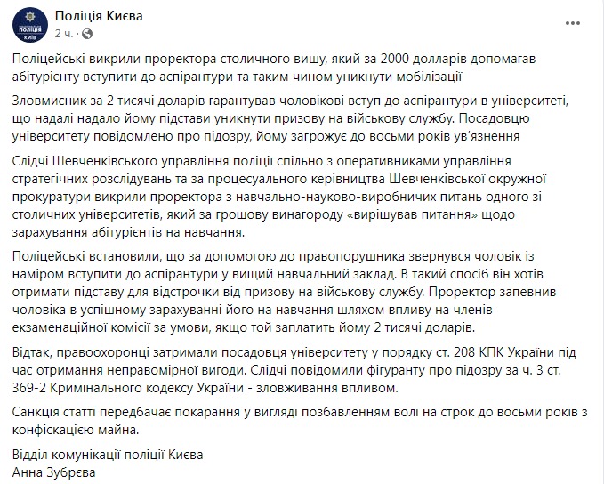 У публікації поліції не вказано ім'я фігуранта, проте телеграм-канали пишуть, що йдеться про проректора Національного університету біоресурсів та природокористування.