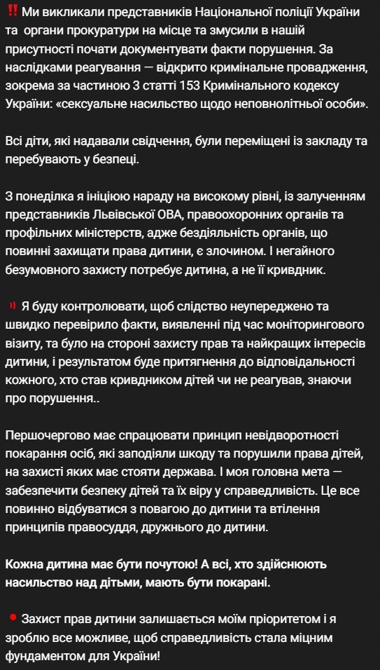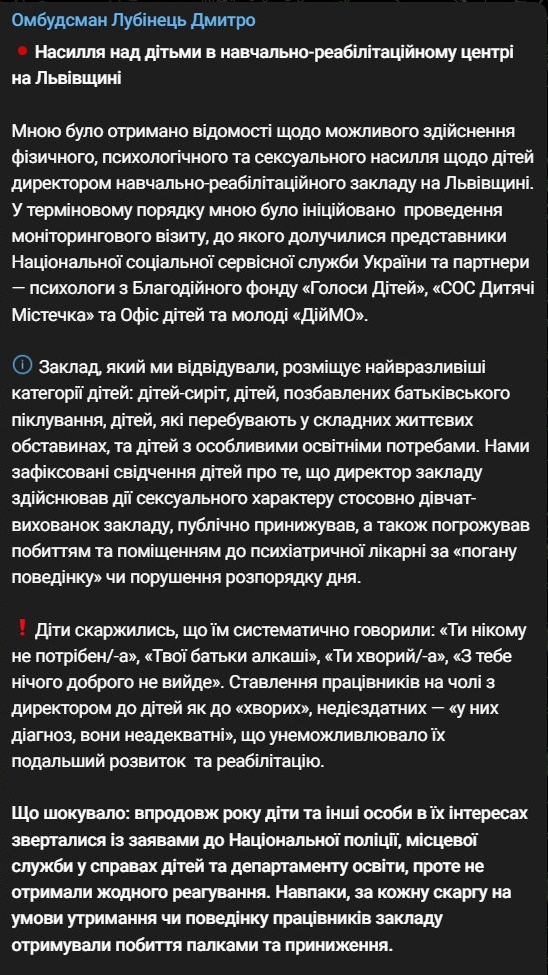 "Мною було отримано відомості про можливе здійснення фізичного, психологічного та сексуального насильства щодо дітей директором навчально-реабілітаційної установи Львівської області", - написав він.