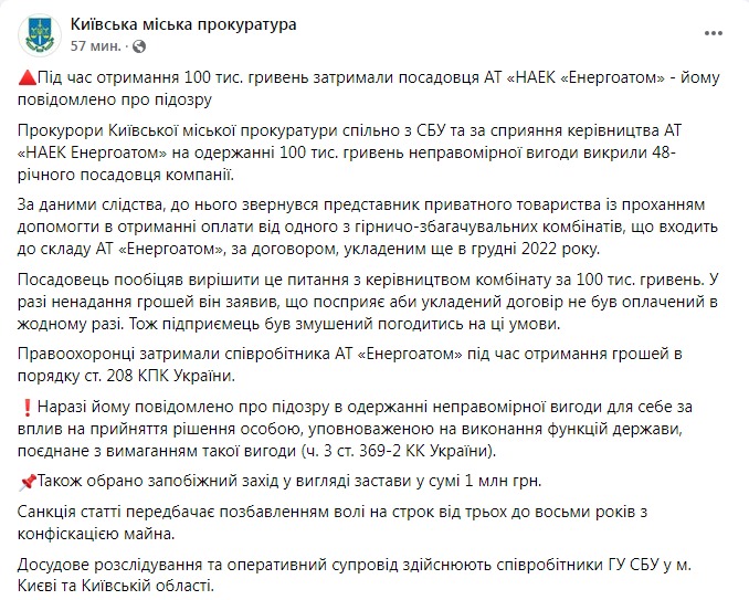 Правоохоронці затримали співробітника "Енергоатому" під час отримання грошей. Йому повідомили про підозру отримання неправомірної вигоди за ч. 3 ст. 369-2 Кримінального кодексу та обрали запобіжний захід у вигляді застави в мільйон гривень. Санкція статті передбачає позбавлення волі на строк від трьох до восьми років із конфіскацією майна.