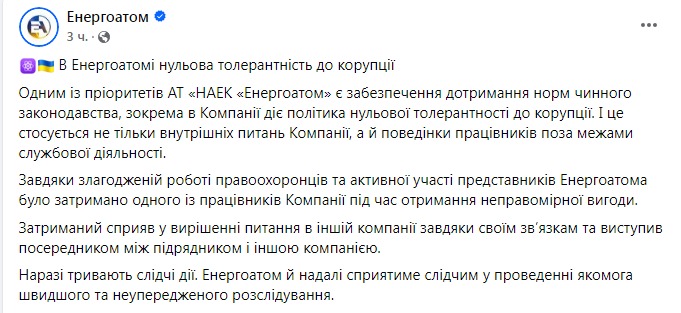 "Енергоатом" вже підтвердив затримання свого менеджера та заявив, що він, користуючись своїми зв'язками, виступив посередником між підрядником НАК та іншою компанією.