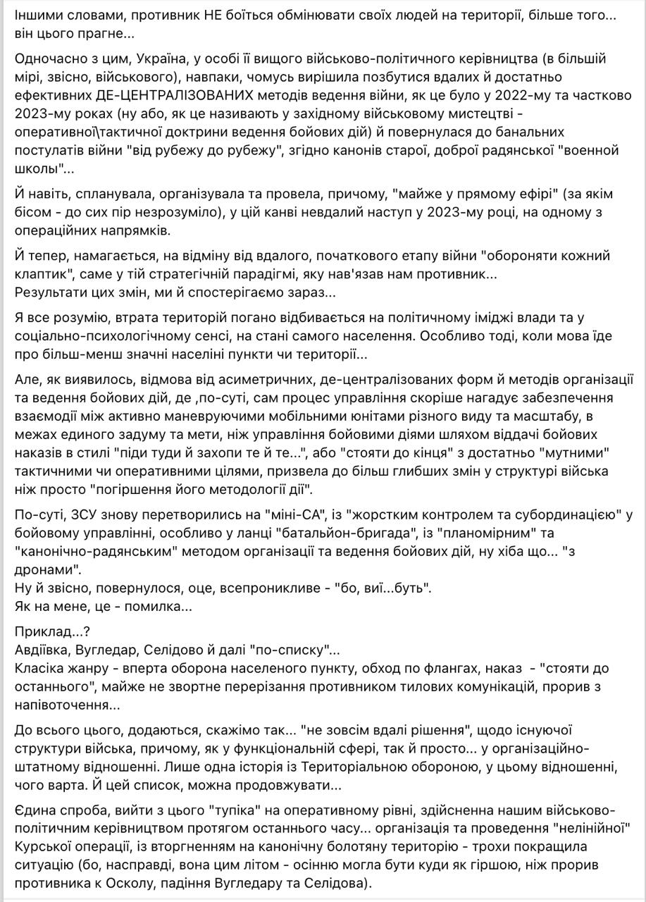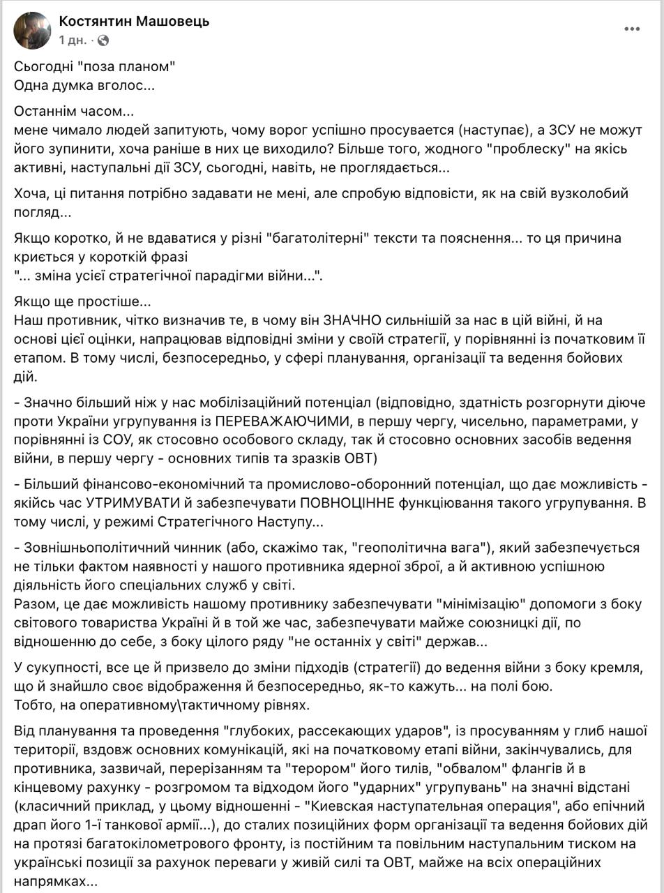 "Противник не боїться обмінювати своїх людей на території, навіть він до цього прагне. Водночас Україна, в особі її вищого військово-політичного керівництва, навпаки, чомусь вирішила позбутися вдалих і досить ефективних децентралізованих методів ведення війни, як це було у 2022 та частково 2023 роках і повернулася до банальних постулатів війни "від рубежу до рубежу", згідно з канонами старої, доброї, радянської "військової школи". у тій стратегічній парадигмі, яку нав'язав нам супротивник. Результати цих змін ми й спостерігаємо зараз", - пише Машовець.