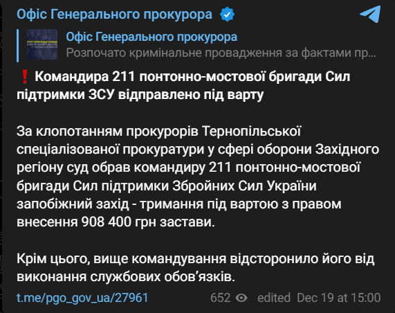 "За клопотанням прокурорів Тернопільської спеціалізованої прокуратури у сфері оборони Західного регіону суд обрав командиру 211 понтонно-мостової бригади Сил підтримки Збройних Сил України запобіжний захід - утримання під вартою з правом внесення 908 400 грн застави", - йдеться у повідомленні.