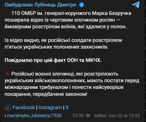 "Повідомлю про цей факт ООН і МКЧХ. Російські військові злочинці, які розстрілюють українських військовополонених, повинні постати перед міжнародним трибуналом і понести найсуворіше покарання, передбачене законом!" – відреагував на розстріл українських військових омбудсмен Дмитро Лубинець.