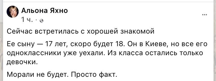 "Зараз зустрілася з гарною знайомою. Її синові 17 років, скоро буде 18. Він у Києві, але всі його однокласники вже поїхали. З класу залишилися лише дівчатка. Моралі не буде. Просто факт", - повідомила Яхно.