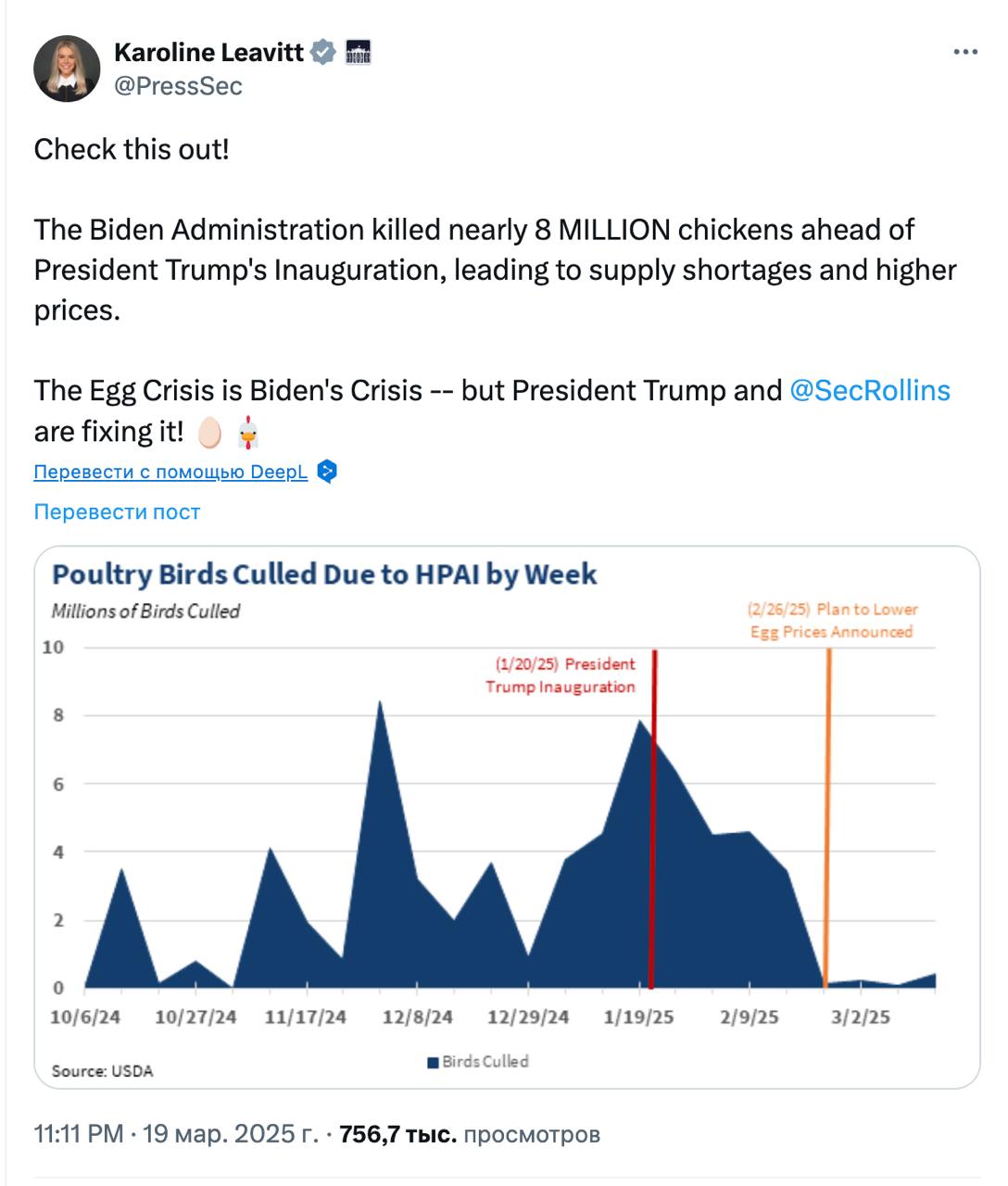 "Адміністрація Байдена вбила майже 8 мільйонів курей напередодні інавгурації президента Трампа, що призвело до дефіциту та зростання цін. Яєчна криза - це криза Байдена, але президент Трамп та міністр сільського господарства Брук Роллінз вирішують цю проблему!" - заявила Левітт, прикріпивши якийсь графік.