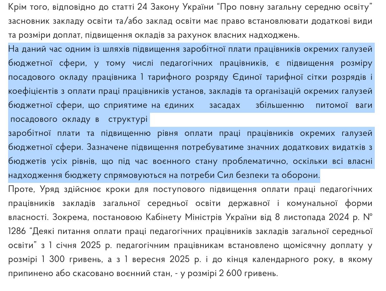 За заявою уряду, вчителі отримують різні доплати, а підвищення розміру посадового окладу "вимагатиме значних додаткових видатків з бюджетів усіх рівнів, що під час воєнного стану проблематично, оскільки всі власні надходження бюджету спрямовуються на потреби Сил безпеки та оборони".