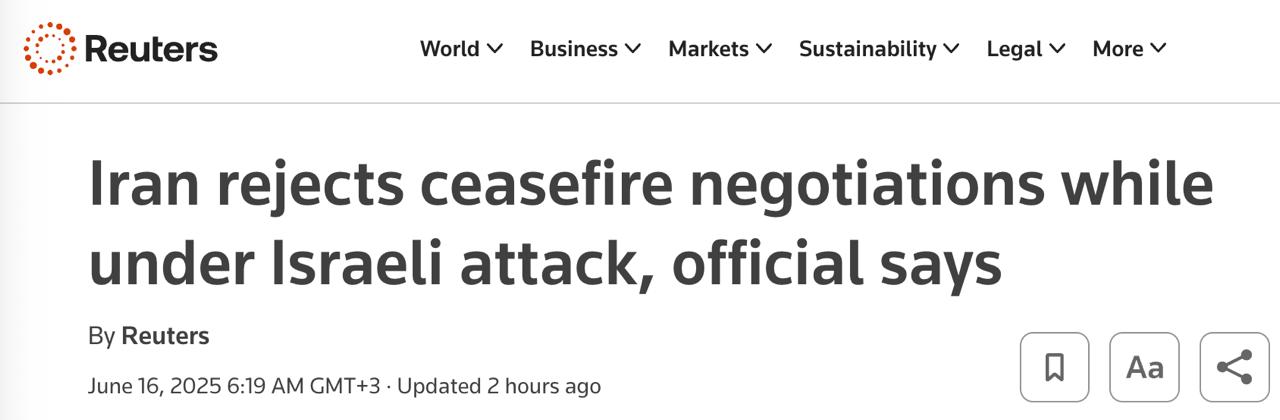 10.56 МЗС Ірану офіційно заявило, що відмовляється вести переговори, поки Ізраїль продовжує завдавати ударів. Раніше про таку позицію Тегерана повідомляли ЗМІ.