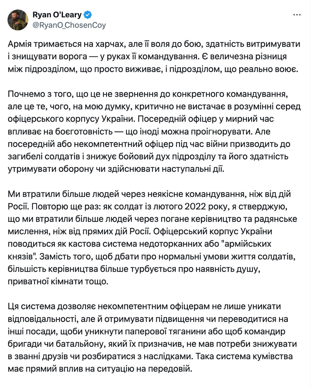 "Як солдатів з лютого 2022 року, я стверджую, що ми втратили більше людей через погане керівництво і радянське мислення, ніж від прямих дій Росії. Офіцерський корпус України поводиться як кастова система недоторканних або армійських князів. командир бригади або батальйону, який їх призначив, не мав потреби знижувати у званні друзів або розбиратися з наслідками. Така система кумівства має прямий вплив на ситуацію на передовій", - написав О'Лірі.