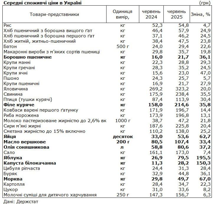Про це повідомляє прес-центр Державної служби статистики України у своєму порівняльному звіті цін червня 2024-го та червня 2025 року.