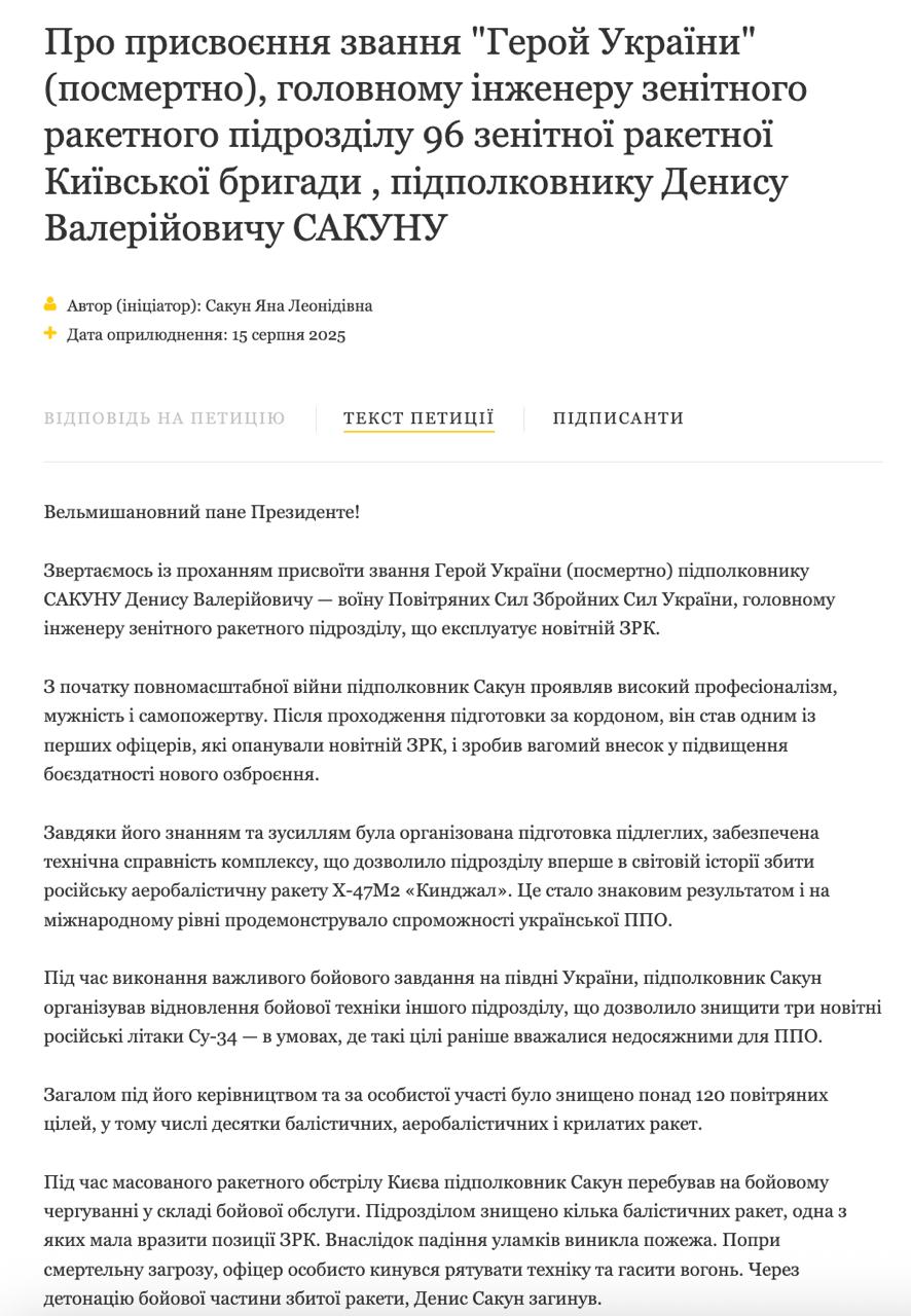 "Під час масованого ракетного обстрілу Києва підполковник Сакун перебував на бойовому чергуванні у складі бойового розрахунку. Підрозділом було знищено кілька балістичних ракет, одна з яких повинна була вразити позиції ЗРК. Внаслідок падіння уламків виникла пожежа. Незважаючи на смертельну загрозу, офіцер особисто кинувся рятувати технік. збитої ракети Денис Сакун загинув", - йдеться у петиції.