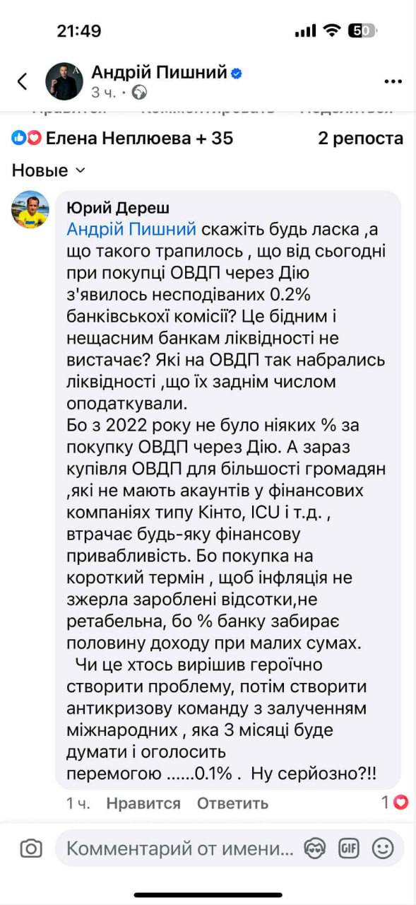 "Що такого трапилося, що при купівлі ОВДП через "Дію" виявилися несподівані 0,2% банківської комісії? Це бідним та нещасним банкам ліквідності не вистачає?" - Запитав користувач Юрій Дереш.