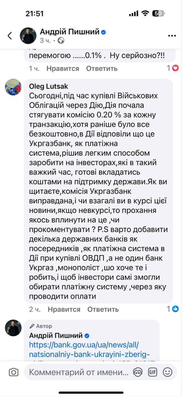 Про це не оголошувалося заздалегідь і комісію виявили за фактом покупок. Після чого закиди посипалися у коментарях на особистій сторінці голови Нацбанку Андрія Пишного у Фейсбуці.
