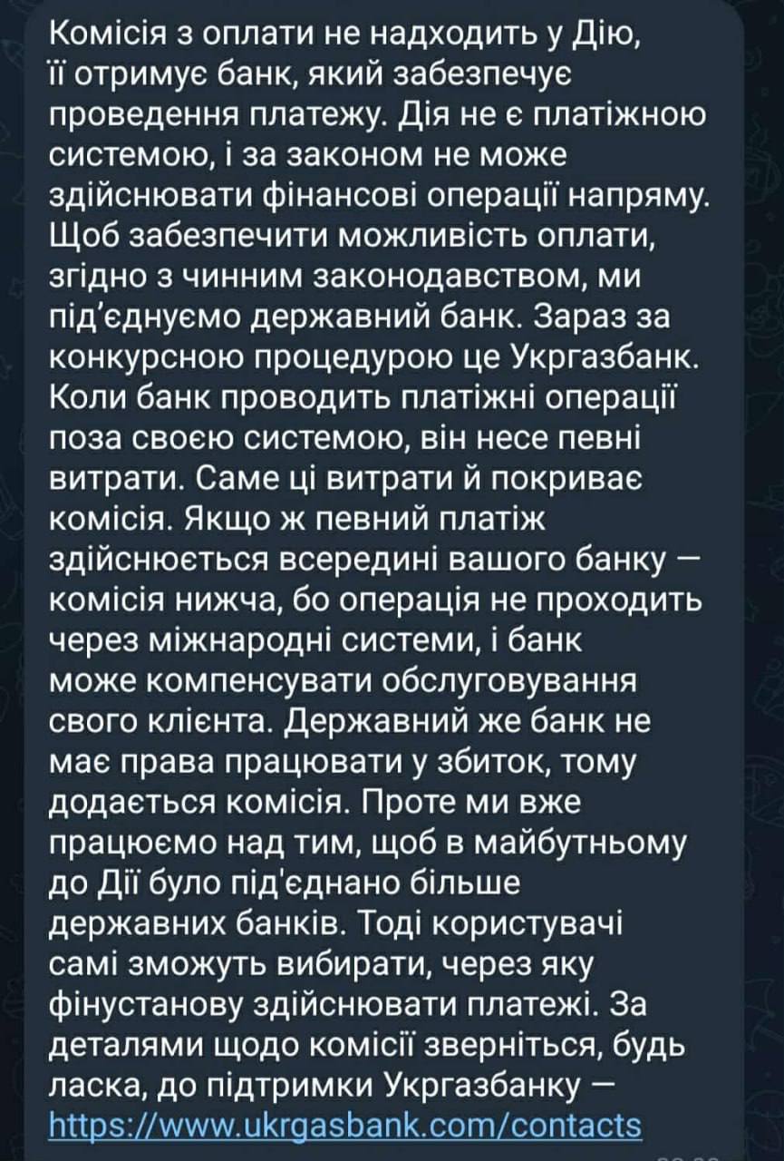 "Дія" не є платіжною системою, і за законом не може здійснювати фінансові операції безпосередньо. Щоб забезпечити можливість оплати, згідно із чинним законодавством, ми підключаємо державний банк. Нині за конкурсною процедурою це "Укргазбанк". Коли банк проводить платіжні операції поза своєю системою, він несе певні витрати. Саме ці витрати і покриває комісія", - відповіли у "Діє".