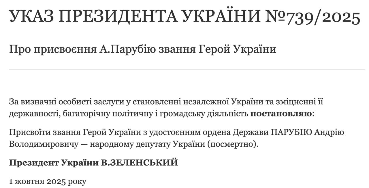 "За видатні заслуги у становленні незалежної України та зміцненні її державності, багаторічну політичну та громадську діяльність ухвалюю: присвоїти звання Герой України з удостоєнням ордена держави Парубію Андрію Володимировичу – народному депутату України (посмертно)", - говорить указ.