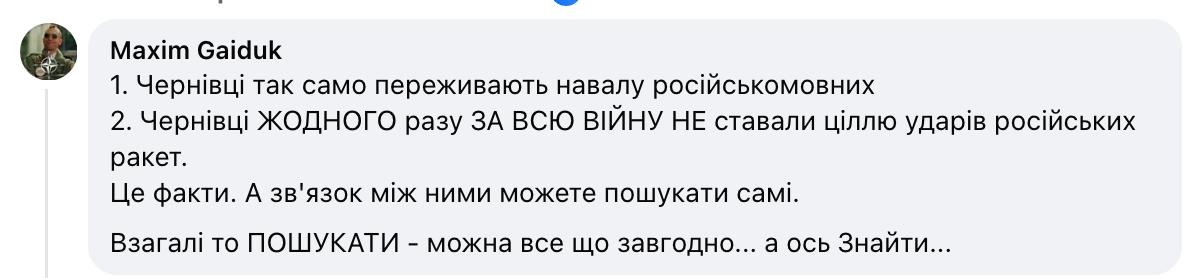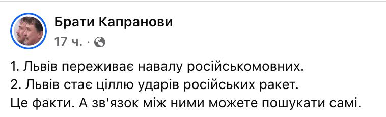 Письменник Віталій Капранов фактично звинуватив у нещодавньому ракетному ударі по Львову російськомовних біженців. "Львів переживає навалу російськомовних. Львів стає метою ударів російських ракет. Це факти. А зв'язок між ними можете пошукати самі", - написав він у Facebook.