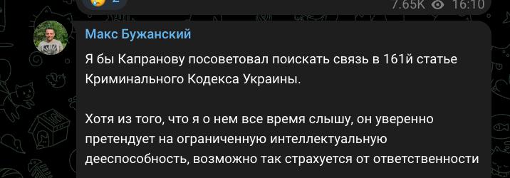 "Я б Капранову порадив пошукати зв'язок у 161 статті Кримінального Кодексу України (про порушення рівноправності громадян - Ред.). Хоча з того, що я про нього весь час чую, він впевнено претендує на обмежену інтелектуальну дієздатність, можливо так страхується від відповідальності", - написав нардеп Максим Бужанський.