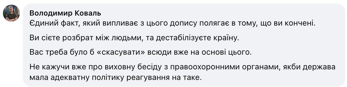 "Єдиний факт, який випливає з цієї посади, полягає в тому, що ви - кінчений. Ви сієте різницю між людьми і дестабілізуєте країну. Вас варто було б "скасувати" всюди вже на підставі цього. Не кажучи вже про виховну бесіду з правоохоронними органами, якби держава мала адекватну політику реагування на Коваль.