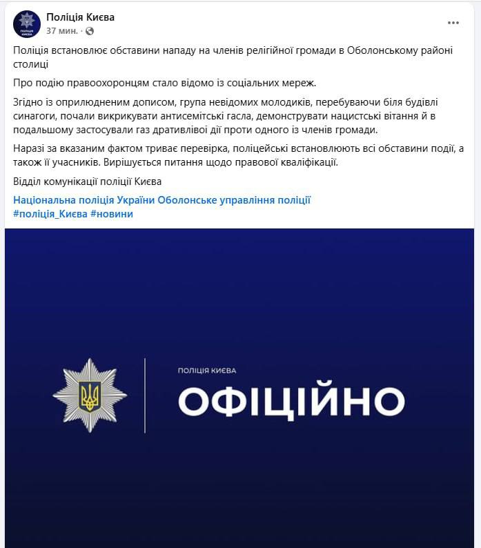 Київська єврейська громада заявляє, що кілька молодих людей підійшли до синагоги та почали "демонстративно зигувати". Представник громади вийшов до них, після чого був залитий газом із перцевих балончиків, а нападники втекли.