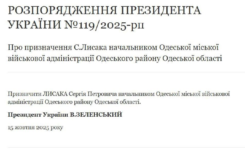 "Призначити Лисака Сергія Петровича начальником Одеської міської військової адміністрації Одеського району Одеської області. Обов'язки голови Дніпропетровської ОВ тимчасово виконуватиме заступник Владислав Гайваненко", - сказано в документі.