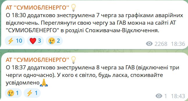 Про запровадження додаткових відключень повідомляє і Сумиобленерго.