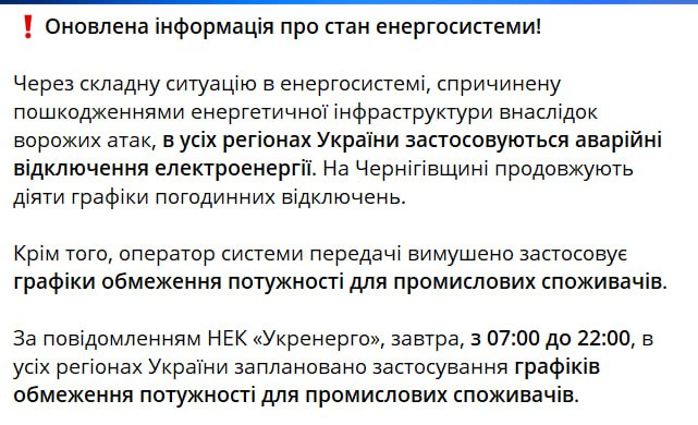 За інформацією, завтра з 7:00 до 22:00 по всій країні діятимуть графіки відключень для промспоживачів.