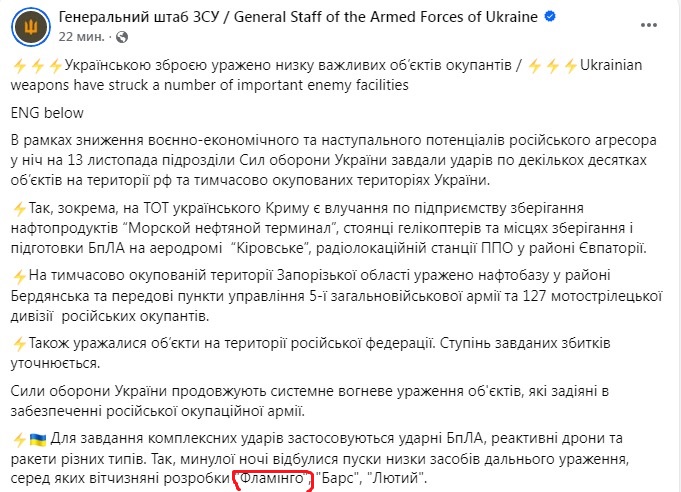 А сьогодні Генштаб у своїх соцмережах розповів про удари по десятках об'єктів на території РФ та окупованих територіях України ракетами "Фламінго", дронами "Лютий" та гібридом ракети та дрону "Барс".